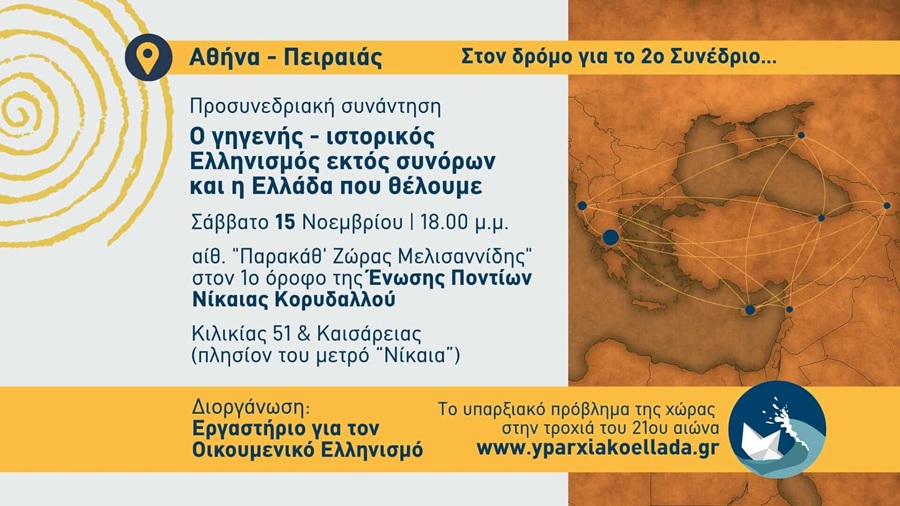 Στην προσυνεδριακή συνάντηση-συζήτηση με θέμα «Ο Γηγενής Ιστορικός Ελληνισμός εκτός συνόρων και η Ελλάδα που θέλουμε», καλεί μέλη και φίλους η Ένωση Ποντίων Νίκαιας-Κορυδαλλού, το Σάββατο 15 Νοεμβρίου, στις 18:00 στην αίθουσα «Παρακάθ’ Ζώρας Μελισσανίδης» στον 1ο όροφο της Ένωσης.