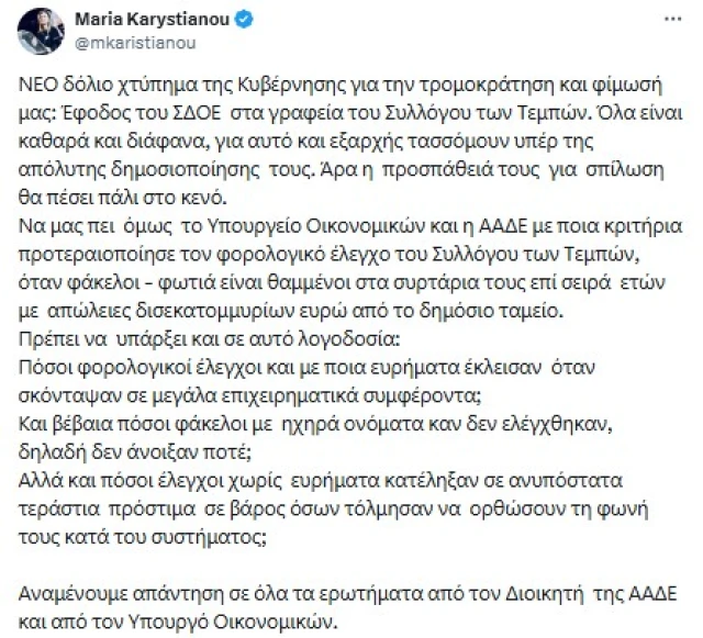 Η κα Καρυστιανού αναφέρει επίσης στην ανάρτησή της ότι «όλα είναι καθαρά και διάφανα, για αυτό και εξαρχής τασσόμουν υπέρ της απόλυτης δημοσιοποίησης τους» και καλεί την ΑΑΔΕ να απαντήσει με ποια κριτήρια προτεραιοποίησε τον φορολογικό έλεγχο του Συλλόγου των Τεμπών.