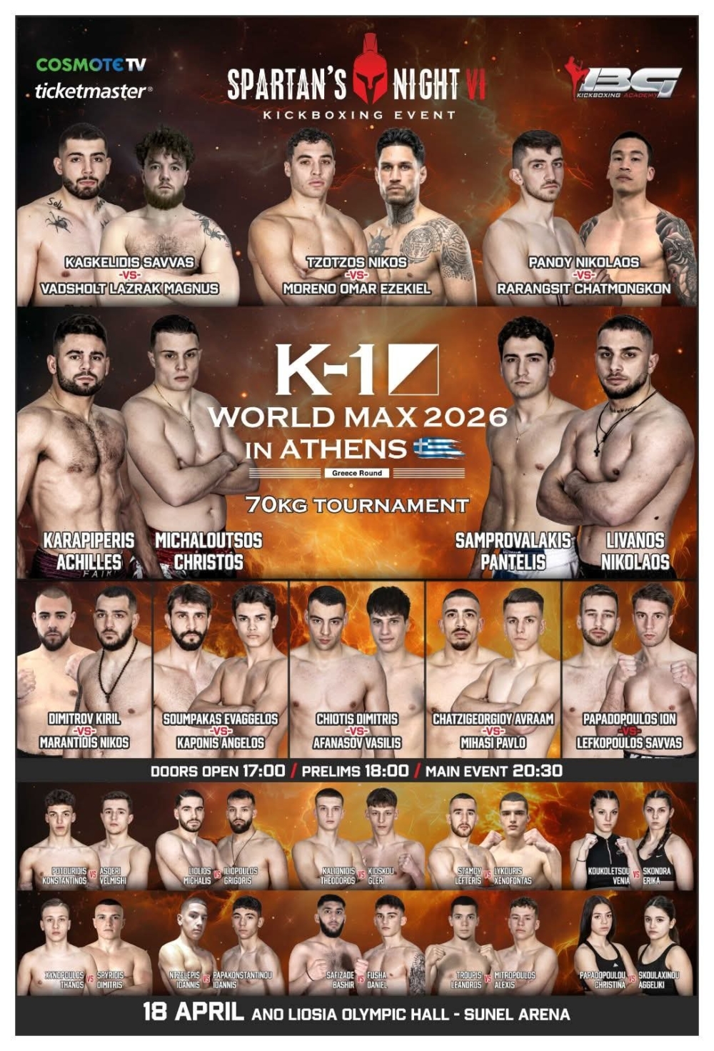 Η καρδιά του kickboxing θα χτυπήσει δυνατά στην Ελλάδα και συγκεκριμένα στα Άνω Λιόσια, στη Sanel Arena, το Σάββατο 18 Απριλίου 2026, καθώς η εκρηκτική διοργάνωση Κ-1 World Max, έρχεται επίσημα στην Ελλάδα, υποσχόμενη ένα εκρηκτικό event, με δυνατές αναμετρήσεις, αδρεναλίνη και υψηλό αγωνιστικό επίπεδο. Η συγκεκριμένη διοργάνωση θα πραγματοποιηθεί με την υποστήριξη του Spartan’s Night 6, της σχολής BG KICKBOXING ACADEMY, των Μπάμπη Παπαδόπουλου και Γιώργου Χαλκίδη και σε συνεργασία με το Δήμο Φυλής και το Νομικό Εκπρόσωπο Αθλητισμού και Πολιτισμού «Η Πάρνηθα».