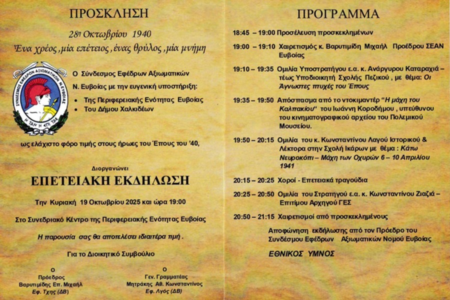 Την Κυριακή 19 Οκτωβρίου 2025, μέλη του Συλλόγου Ποντίων Νομού Ευβοίας «Οι Κομνηνοί», παρακολούθησαν την εκδήλωση του Συνδέσμου Εφέδρων Αξιωματικών Νομού Εύβοιας για το Έπος του ’40.