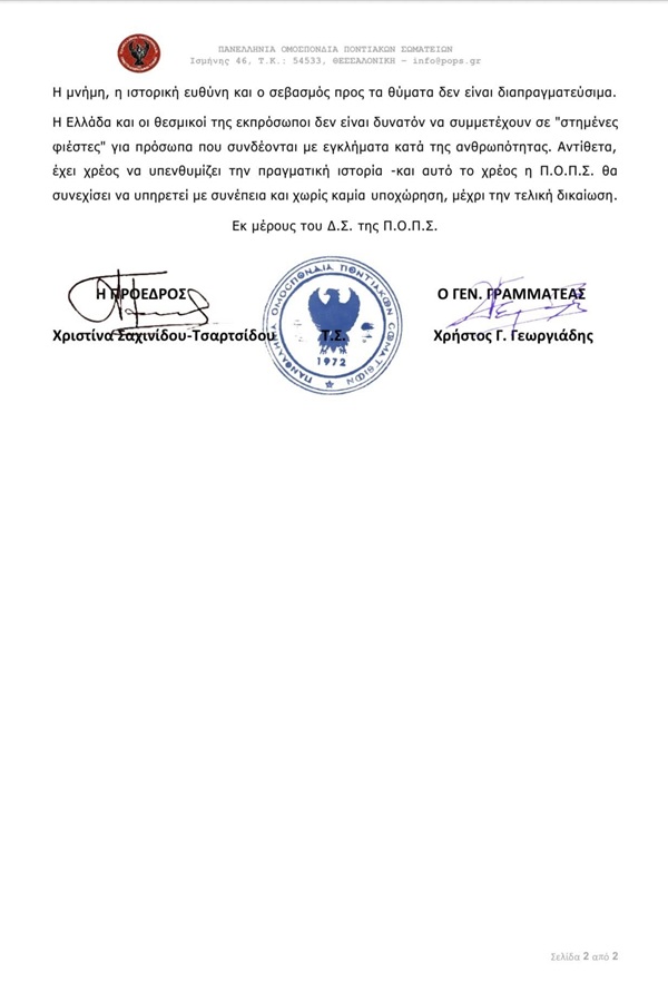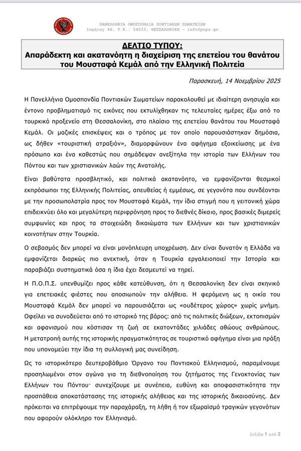 Η Πανελληνία Ομοσπονδία Ποντιακών Σωματείων παρακολουθεί με ιδιαίτερη ανησυχία και έντονο προβληματισμό τις εικόνες που εκτυλίχθηκαν τις τελευταίες ημέρες έξω από το τουρκικό προξενείο στη Θεσσαλονίκη, στο πλαίσιο της επετείου θανάτου του Μουσταφά Κεμάλ.
