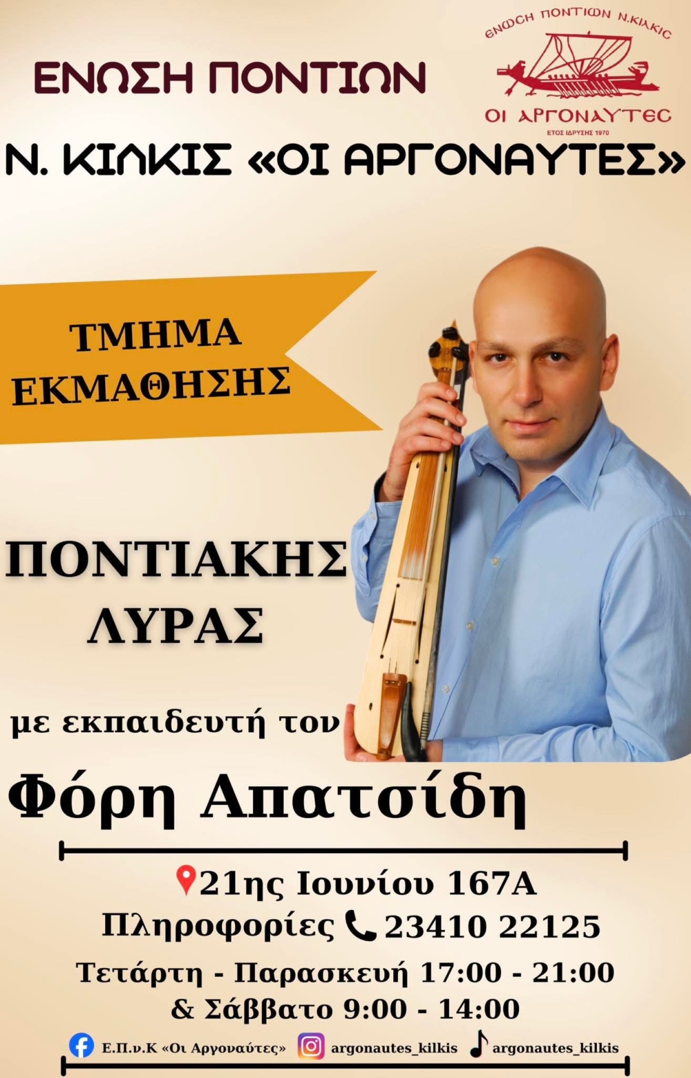 Η Ένωση Ποντίων Νομού Κιλκίς «Οι Αργοναύτες» ενημέρωσε, μέσω μηνύματος στη σελίδα της, τους φίλους και τα μέλη της, για την έναρξη τμήματος εκμάθησης ποντιακής λύρας.