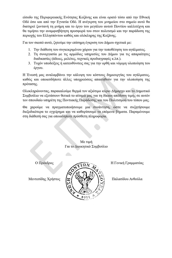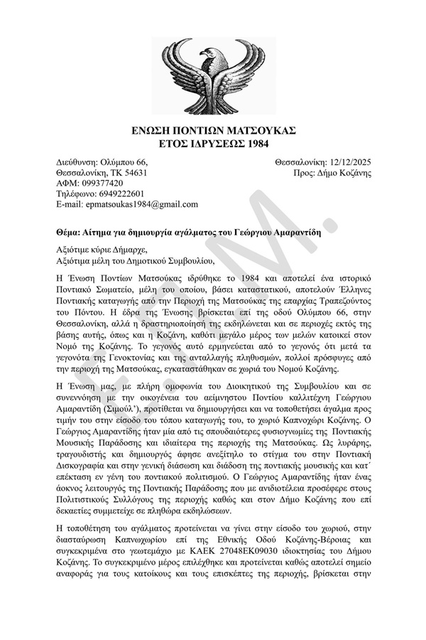 Την Παρασκευή 12 Δεκεμβρίου 2025 η Ένωση Ποντίων Ματσούκας, κατόπιν αρχικής τηλεφωνικής επικοινωνίας με το γραφείο του Δημάρχου Κοζάνης, κατέθεσε έγγραφο αίτημα για την δημιουργία αγάλματος του μεγάλου Πόντιου καλλιτέχνη Γεωργίου Αμαραντίδη.