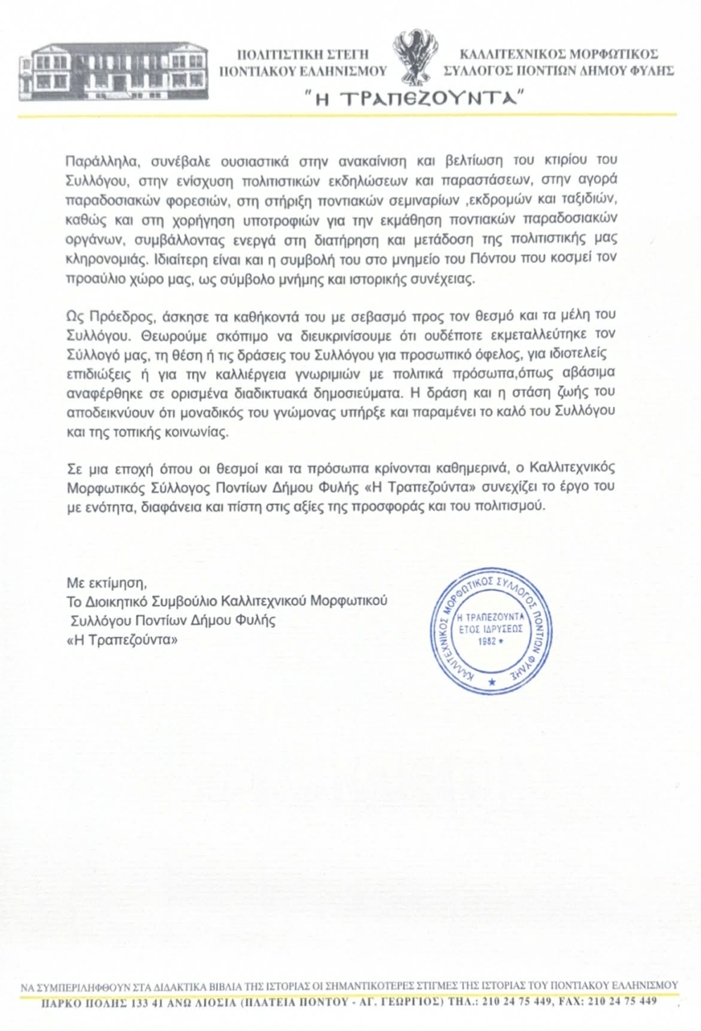Ο Καλλιτεχνικός Μορφωτικός Σύλλογος Ποντίων Δήμου Φυλής «Η Τραπεζούντα» αισθάνεται την ανάγκη να τοποθετηθεί δημόσια και με υπευθυνότητα σχετικά με πρόσφατα δημοσιεύματα, τα οποία επιχειρούν να δημιουργήσουν εσφαλμένες εντυπώσεις για την παρουσία και τη στάση του Προέδρου μας, κ. Ιωάννη Παπαδόπουλου απέναντι στον Σύλλογο μας.