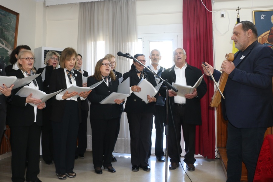 Η χορωδία του σωματείου «Παναγία Σουμελά Δήμου Θέρμης», που με την παρουσία της κέρδισε τα χειροκροτήματα των καλεσμένων απέδωσε τα παραδοσιακά τραγούδια και κάλαντα με την επιμέλεια του κου Γιώργου Στεφανίδη, χοράρχη, λυράρη και τραγουδιστή. Ιδιαίτερη στιγμή αποτέλεσαν τα παραδοσιακά δίστιχα της Γαλίαινας για τον Άγιο Γεώργιο Περιστερεώτα από τον χοράρχη και τον κο Βασίλη Πολατίδη του «Καλλιτεχνικού Χορευτικού Ομίλου Πύρριχος».