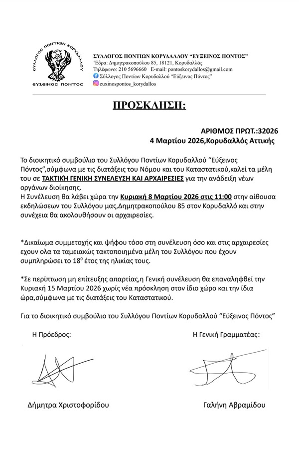 Σε Τακτική Γενική Συνέλευση καλεί τα τακιτκά του μέλη ο Σύλλογος Ποντίων Κορυδαλλού «Εύξεινος Πόντος», την Κυριακή 08 Μαρτίου 2026, στις 11:00, στην αίθουσα εκδηλώσεωντου Συλλόγου.