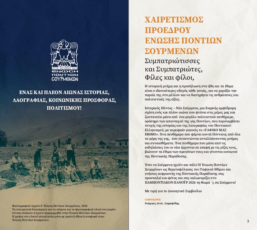 Το πρόγραμμα του «Παμποντιακού Πανοΰρ 2026» ανακοίνωσε η Ένωση Ποντίων Σουρμένων. Ένα γεγονός που είναι κάθε χρόνο λόγος και χώρος συνάντησης όλων των Ποντίων την Κυριακή του Θωμά, στην πλατεία Σουρμένων.
