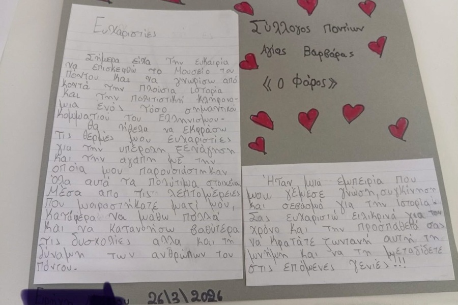 Με έντονη συγκίνηση και θερμή ανταπόκριση από το κοινό πραγματοποιήθηκαν μέχρι σήμερα οι εκπαιδευτικές επισκέψεις μαθητών σχολείων και οργανωμένων φορέων στην Έκθεση Λαογραφίας «Μνήμες Πόντου» που διοργανώνει ο Σύλλογος Ποντίων Αγίας Βαρβάρας «Ο Φάρος».