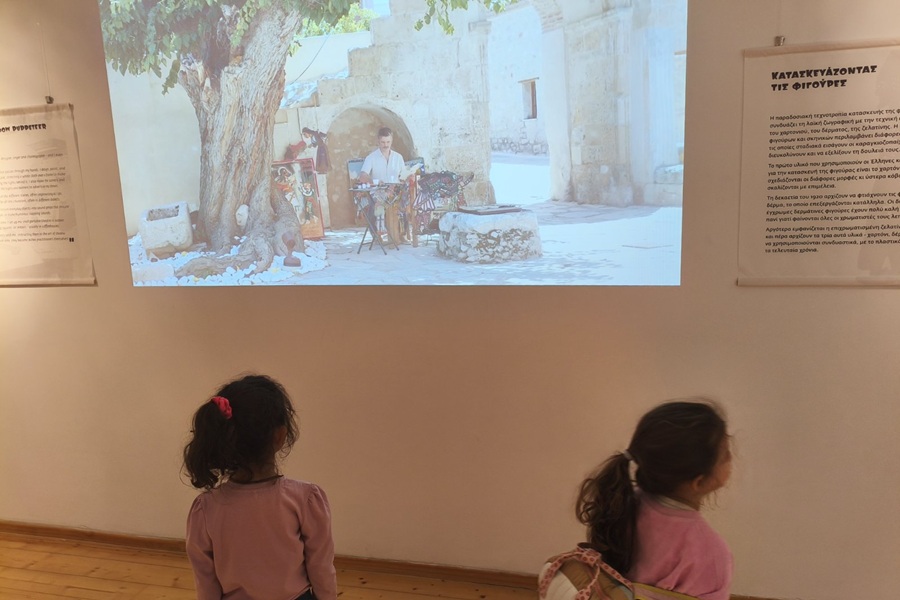 Παράλληλα, τα παιδιά θαύμασαν φιγούρες κατασκευασμένες από δέρμα και χαρτόνι, γνωρίζοντας από κοντά την τέχνη και την τεχνική πίσω από το Θέατρο Σκιών.